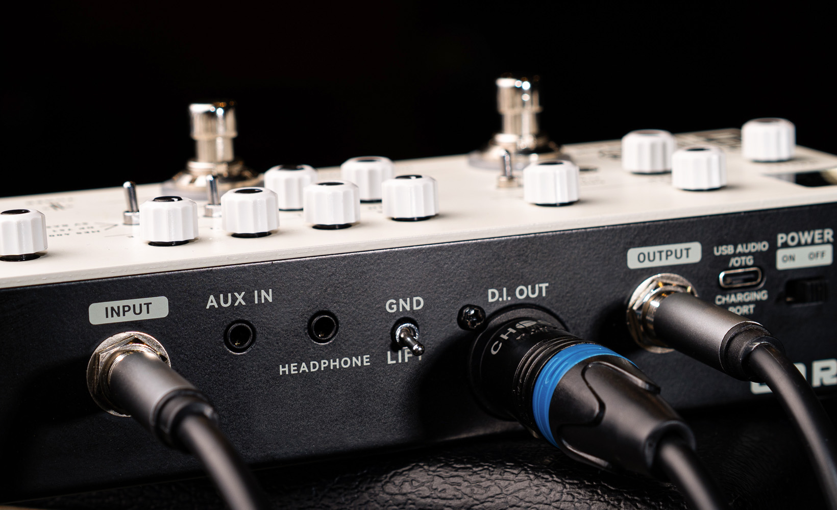 Supports 1/4" TS output, XLR output (D.I.), headphone output, and AUX Input.