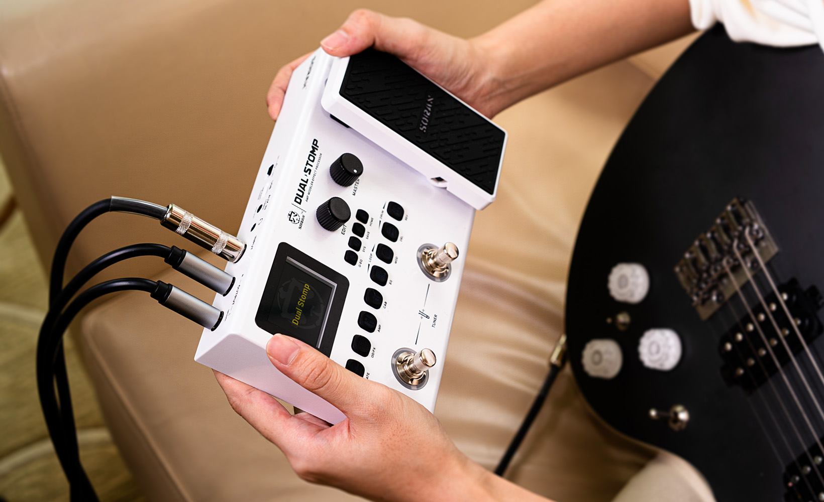 Dual Stomp is a versatile multi-effects processor designed for both guitarists and bassists, perfectly suited for daily practice, band rehearsals, and even small live performances. It combines portability, flexibility, and professional sound quality, packing a complete signal chain into a compact chassis. Powered by DSM Dynamic Spectrum Modeling, Dual Stomp accurately captures the dynamics and nuance of tube amplifiers, while supporting NAM and IR file loading to unlock virtually unlimited tonal options. With 126 built-in effects and 11 modules running simultaneously, plus dual-mode expression pedal control, it delivers natural and expressive real-time performance. Bluetooth and PC editing offer easy remote adjustment and streamlined preset management. A built-in 48kHz/24-bit audio interface and up to 6 hours of rechargeable play time ensure seamless recording and mobility. The 2-inch HD color display provides clear, intuitive operation. From practice to performance, Dual Stomp keeps your tone consistently professional.